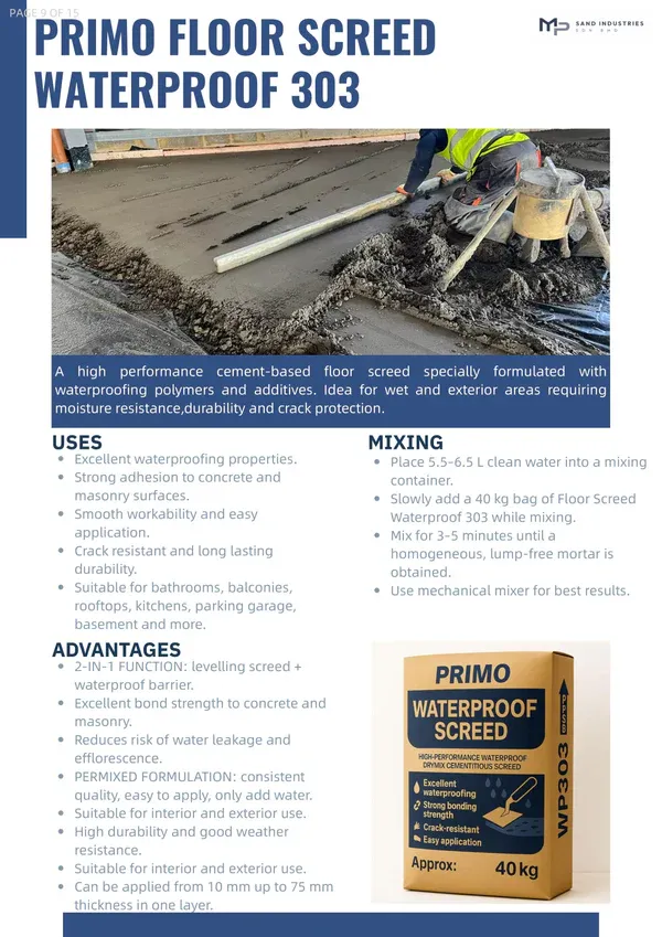 + Free ShippingWaterproof Screed 三合一防水地台灰 is a specially blended premixed waterproof mortar designed for levelling rough and uneven concrete floors. It serves as both underlayment and overlayment, offering excellent waterproofing to prevent water seepage through concrete. Suitable for interior and exterior applications, it provides a stable base for ceramic, homogeneous tiles, marble, and granite slabs.